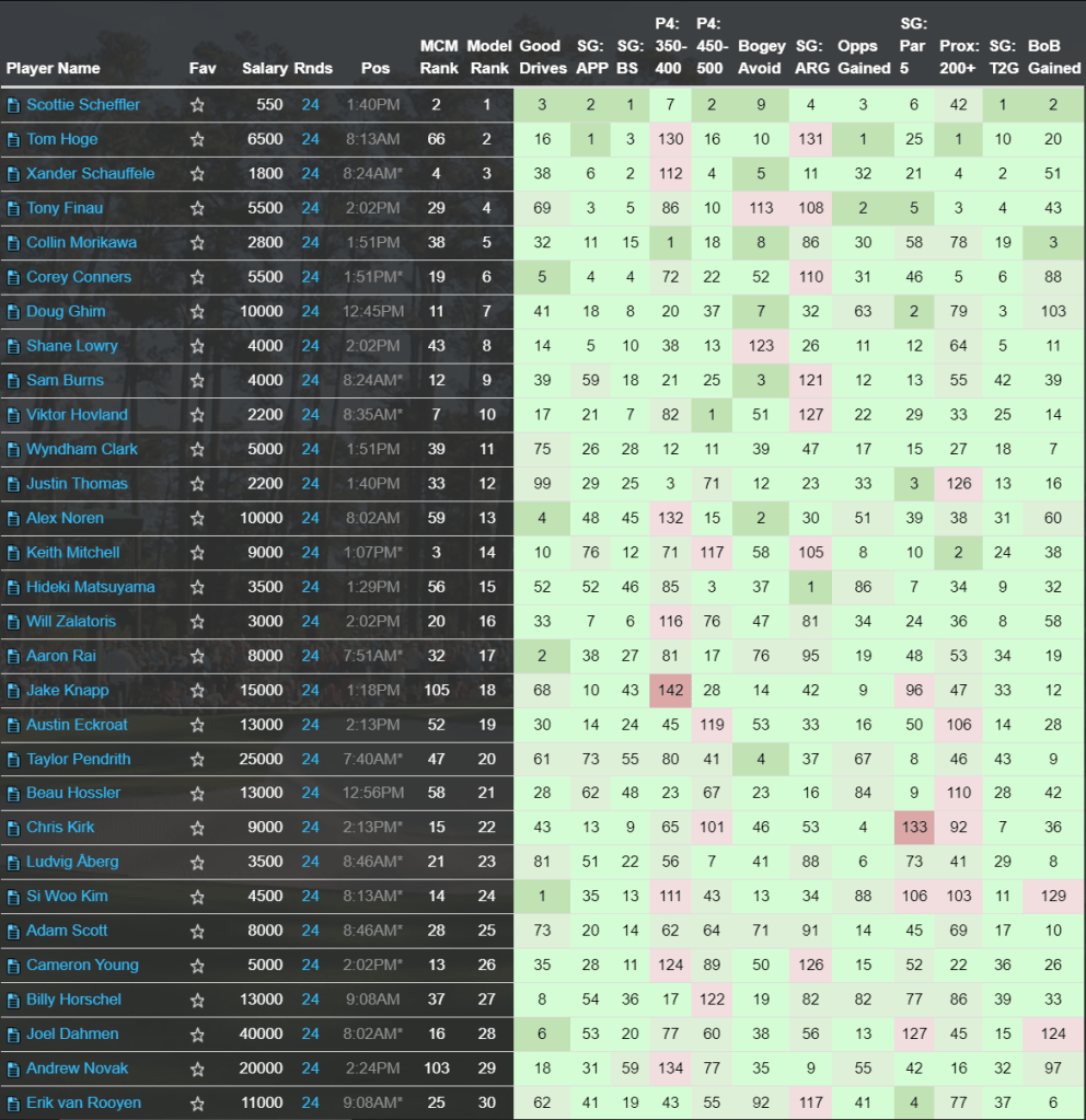 Massive purse this week so another big week to get it right and gain some separation in your pool. Given the volatility of this event, I would skip the very top of the board and head to a loaded middle tier which has plenty of winning upside and decent floor. Scottie would be an easy click and I wouldn’t fault anyone for doing that but even he owns a missed cut here which would be a killer in OAD. I’m going to look towards Lowry, Deki, or Zal myself and would also give strong leans to JT or Xander towards the top. Also don’t mind getting a little frisky with Conners. Probably won’t win but he’s crushing it off the tee and on approach. A lock for Top 20 and likely Top 10 finish.