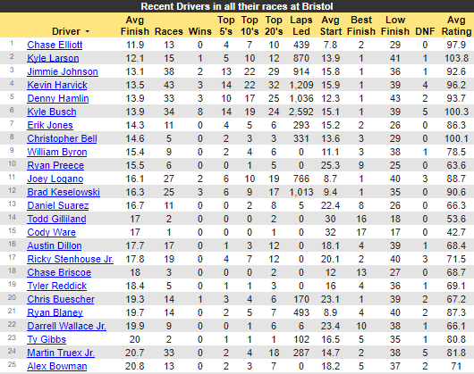 Party Marty Truex does not have the greatest track history at Bristol. He has actually never won here. But he is an excellent short(er) track driver (albeit better in 1-milers) and a solid history at other concrete tracks. Just food for thought at this point.