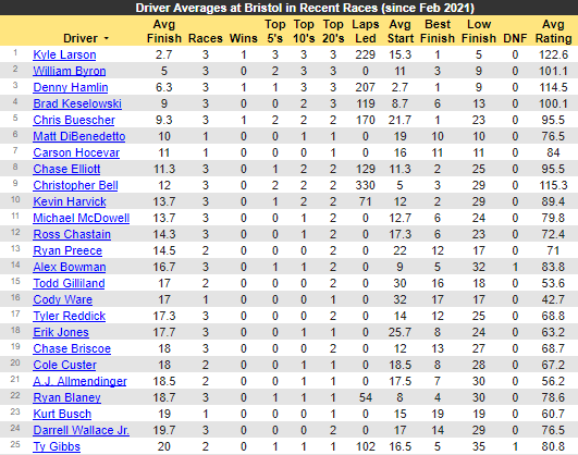 Comps and everything else are a little tricky this week. For starters, Bristol is a track all on its own and there are no true comps. The only other considerations are short track history and history on concrete. Secondly, for the last 3 years, the spring race was a Dirt race. This was a COVID implement to boost attendance, but the gimmick is gone and we are back to normal. That being said, that means there are only 3 races since 2021 run on the concrete to look at for normal track history. The 3 races on dirt dont really give the insight we need. Since 2021, your 3 winners are Kyle Larson (2021), Chris Buescher (2022), and Denny Hamlin (2023). Keep in mind these are all from the fall race. Out of all active drivers, Kyle Busch has the most wins all time with 8, but his last win here was on dirt in 2022. Before that, his latest wins were when he won 3 out of 4 races from fall 2017 through spring 2019. Fun Fact, his brother Kurt won the 4th race sandwiched in there.