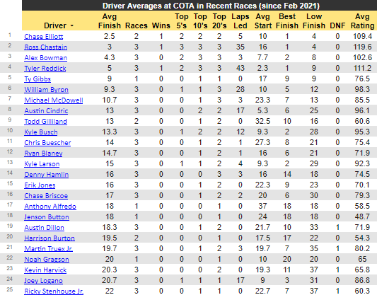Quickly, comps are obviously going to be all your road courses; Indy road, Road America, Sonoma, Watkins Glenn, and recently, Chicago Street (sorta). Pooling them all together, the top performers at road courses since 2021 are Larson, Reddick, Elliott, Bell, Allmendinger, all with 2 or more wins at road courses. Dropping the stats for CotA below.