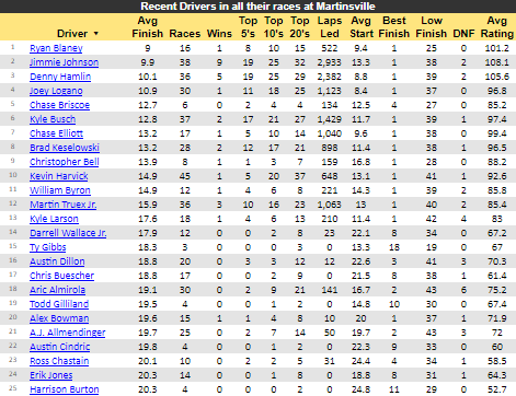 Kyle Larson is your defending Spring Race champion. Ryan Blaney won the fall playoff race here on his way to the cup championship. Comps for Martinsville include, Phoenix, Richmond, and New Hampshire. Comps can sort-of extend to World Wide Technology Raceway (aka Gateway) and Nashville wince they are mostly flat. Looking at comp tracks, your winningest active drivers are Kyle Busch and Joey Logano (3) at Phoenix, Kyle Busch (6) at Richmond, Denny Hamlin and Kyle Busch (3) at New Hampshire. Then there is Busch and Logano (1) at WWT/Gateway, and Larson, Chastain, Elliott (1) at Nashville. Kyle Busch’s name is up there a lot, but he is STRUGGLING this season. I’m off him until he shows me something. Having said that, lets see if the Martinsville stats can help us target a solid candidate.